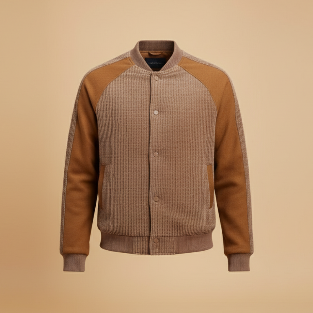 This bomber jacket features a patchwork shoulder design with front zipper closure and ribbed cuffs. It includes a thick fleece lining for added warmth and structure. The jacket’s practical pockets and classic collar create a coordinated outerwear piece suitable for everyday and seasonal use.