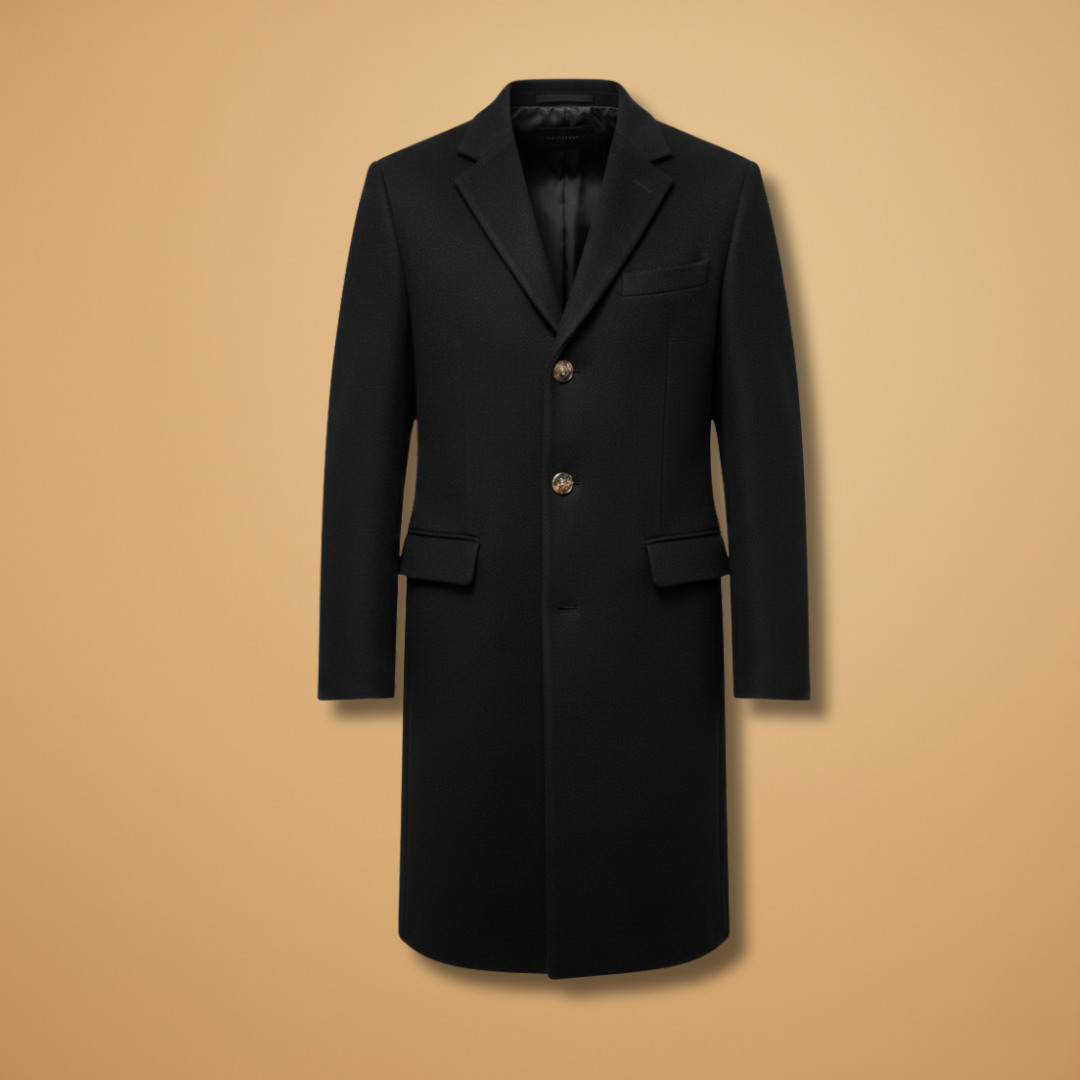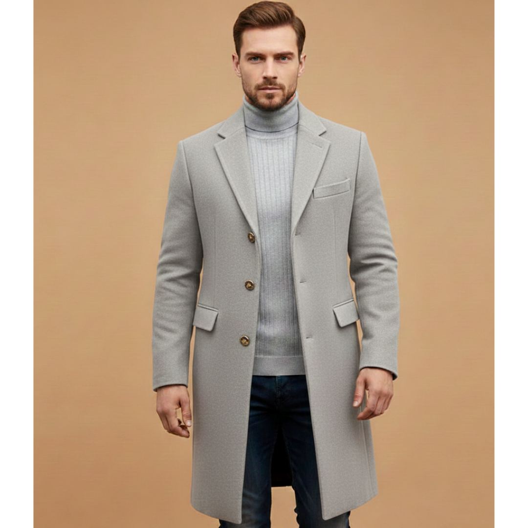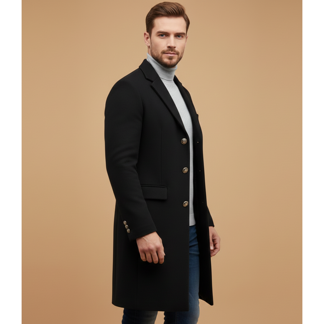 Men's Long Coat with Notched Lapel and Button Closure