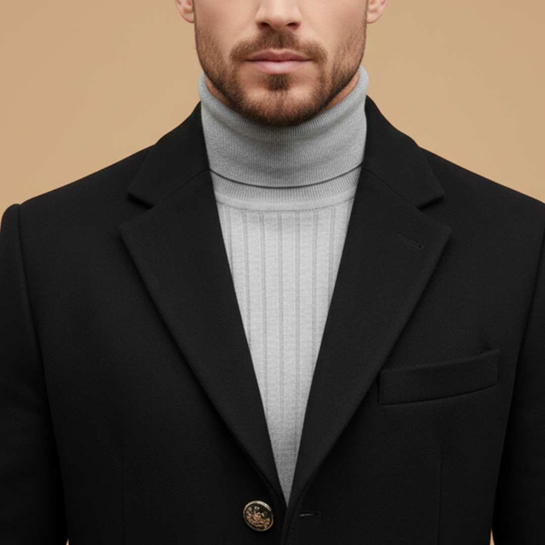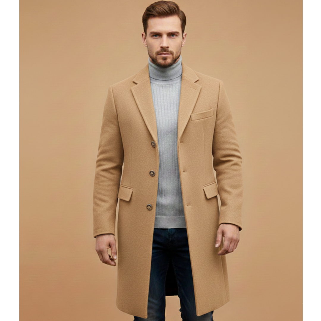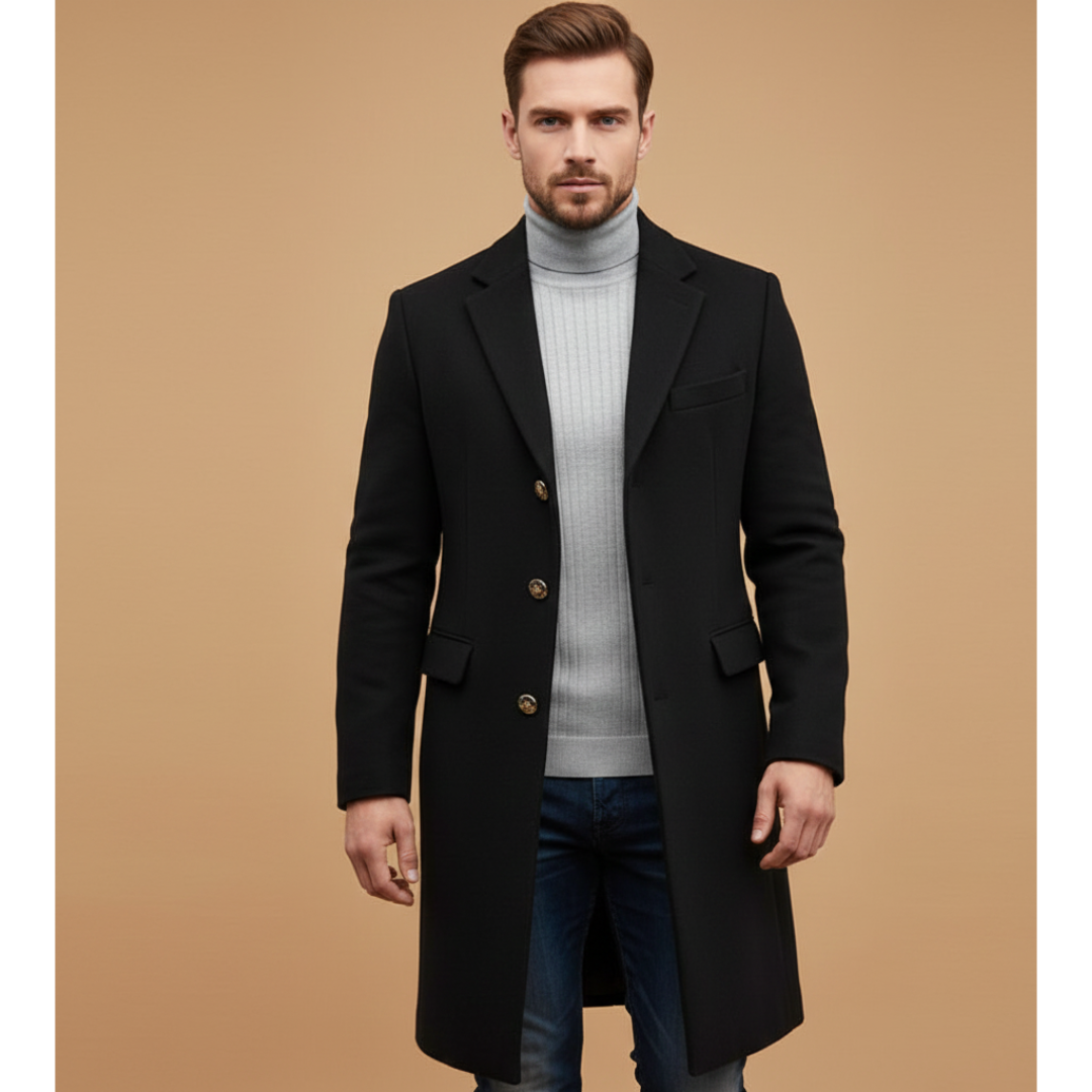 Men's Long Coat with Notched Lapel and Button Closure