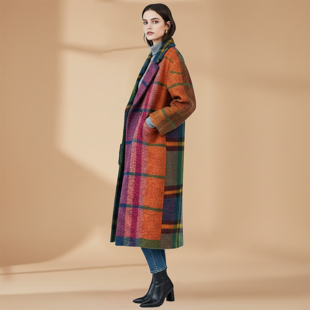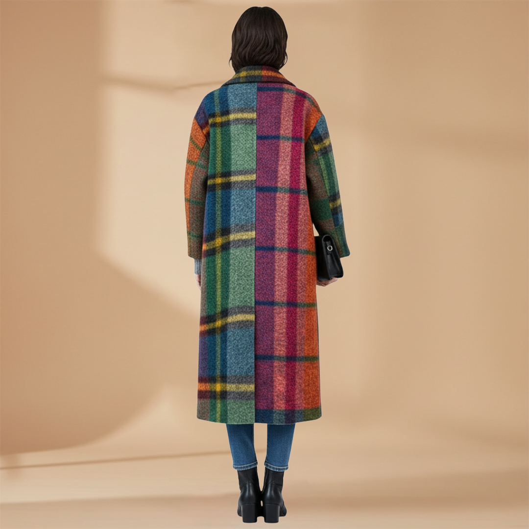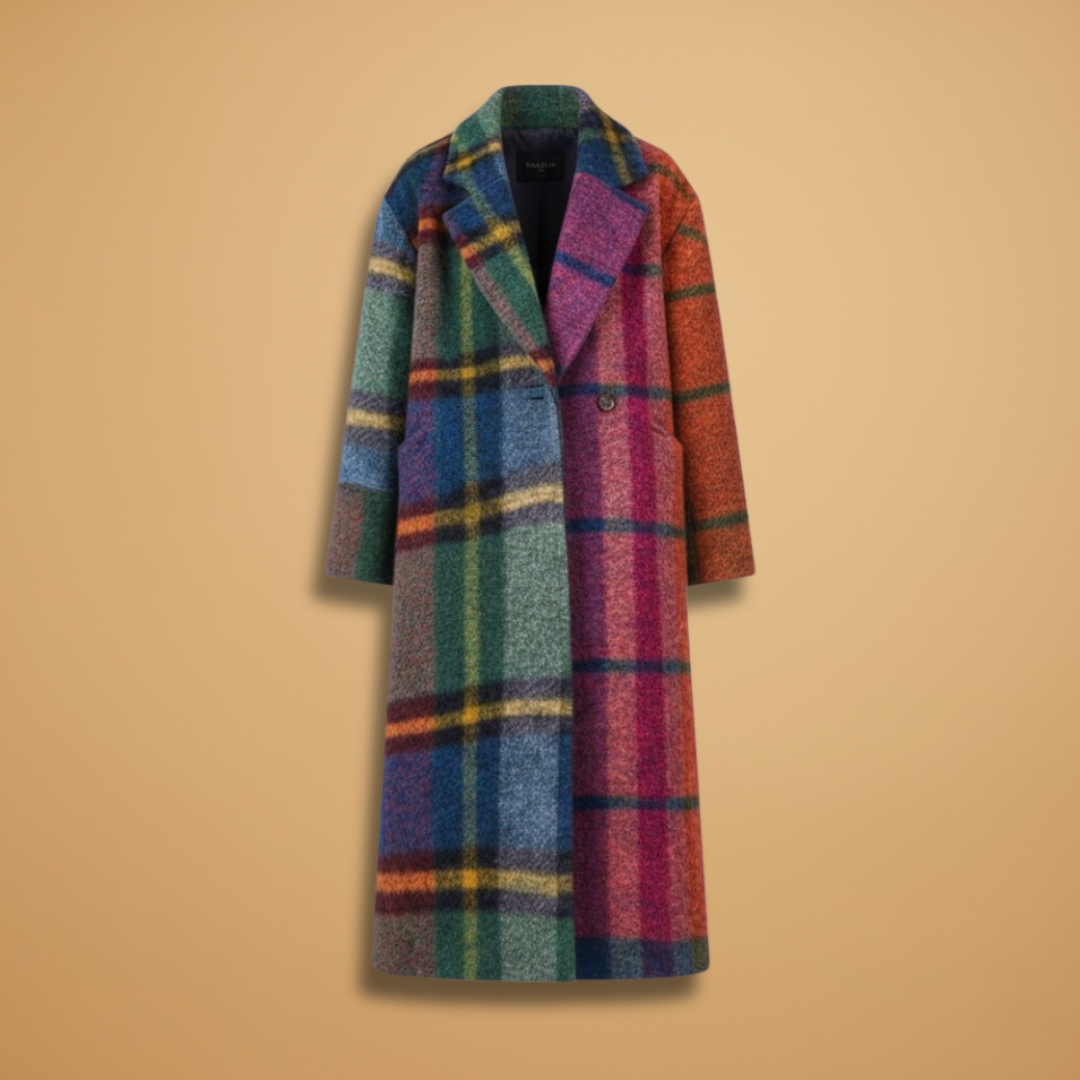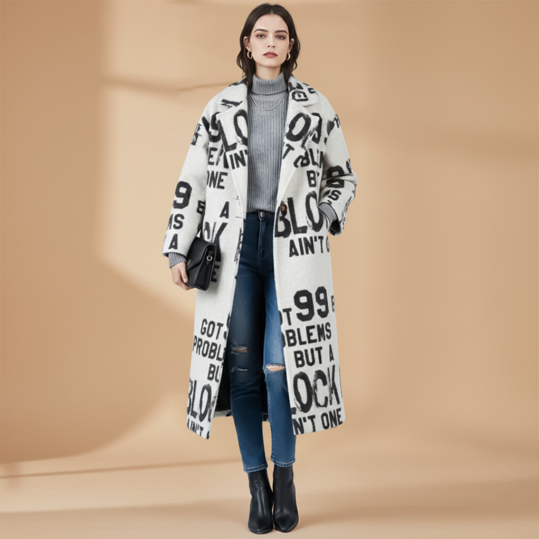 This long women's coat features a lapel collar at the neckline and a button closure at the front. Two side pockets are placed along the body. The long straight sleeves extend to the wrists. The straight cut reaches the calf and is finished with a evenly distributed printed pattern.