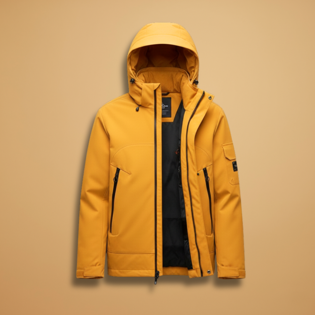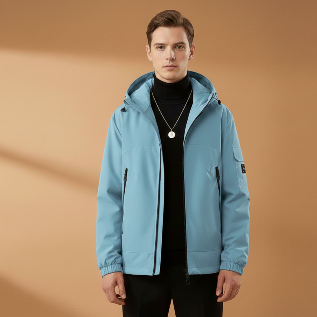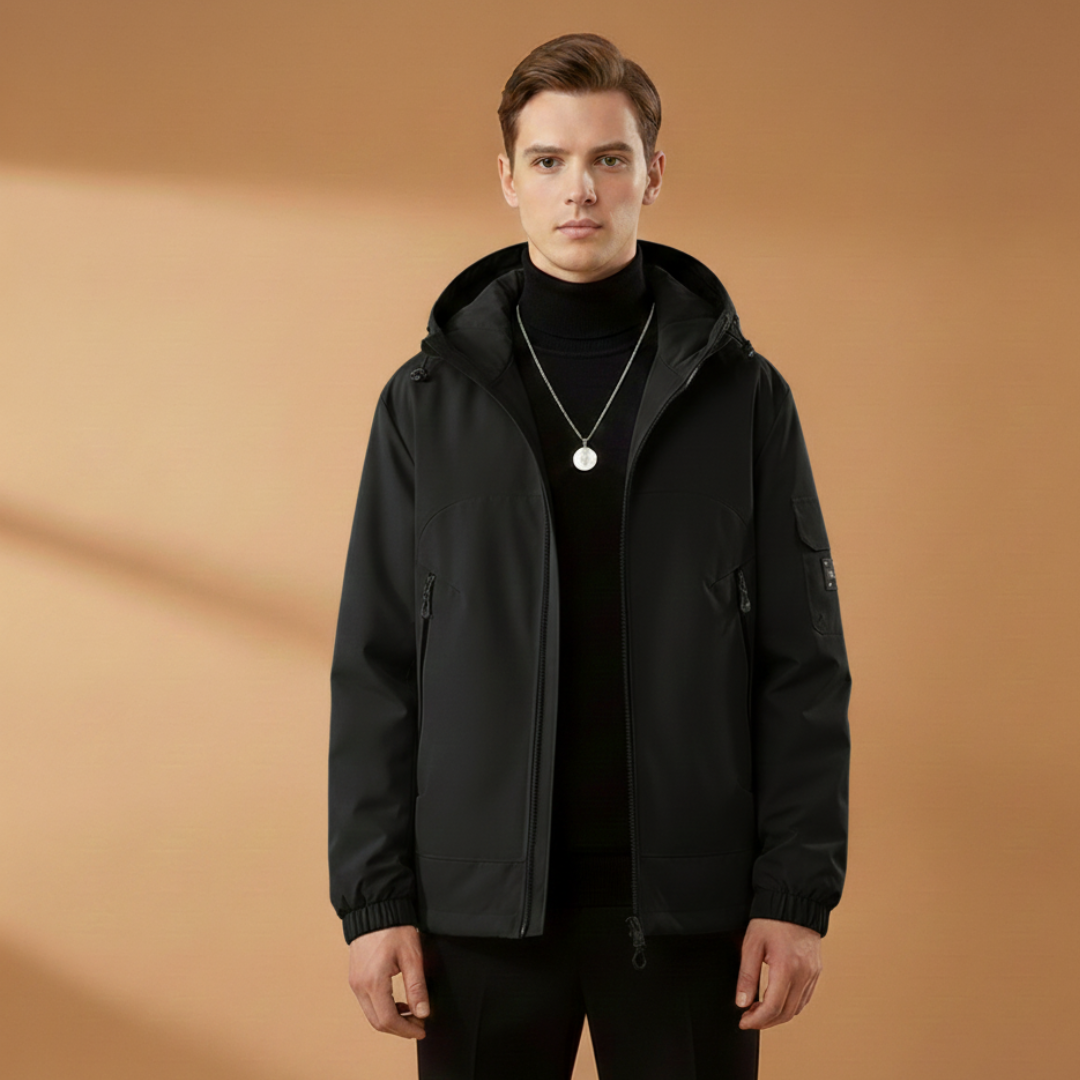 This men’s jacket features an integrated hood with drawstrings, a full-length front zip, and two side zip pockets with an added sleeve pocket. Long sleeves finish with elasticated cuffs, and the straight hem forms a clean lower edge. The outer surface shows a plain appearance across the exterior.