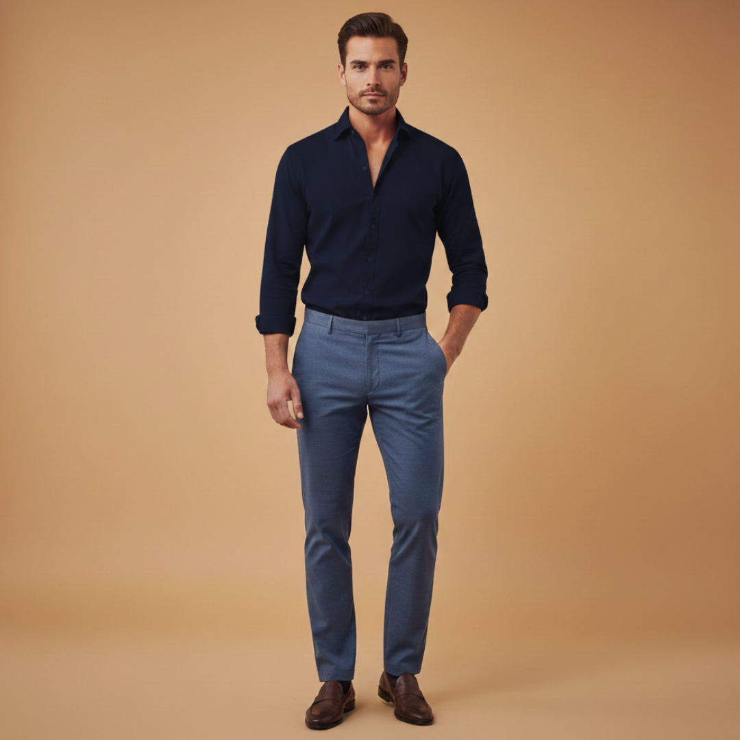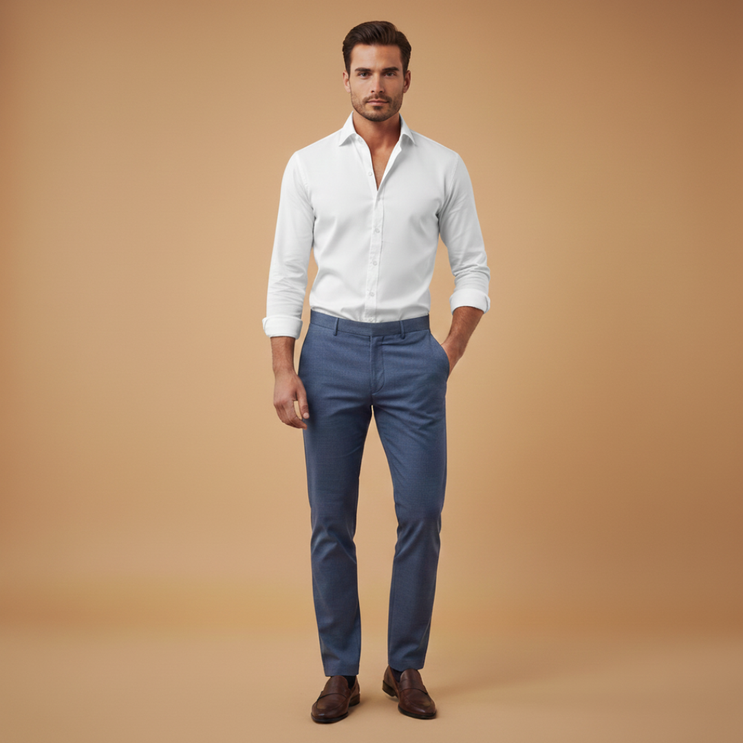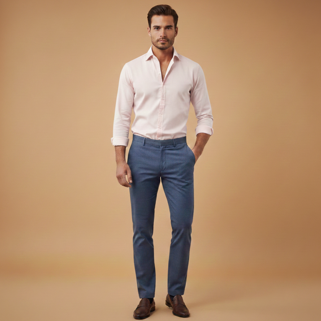 This men’s shirt includes a pointed collar, a full-length button closure, and long sleeves with buttoned cuffs. The straight hem provides multiple styling options. The outer surface shows a plain woven finish extending from collar to hem, forming an even appearance across the entire structure.