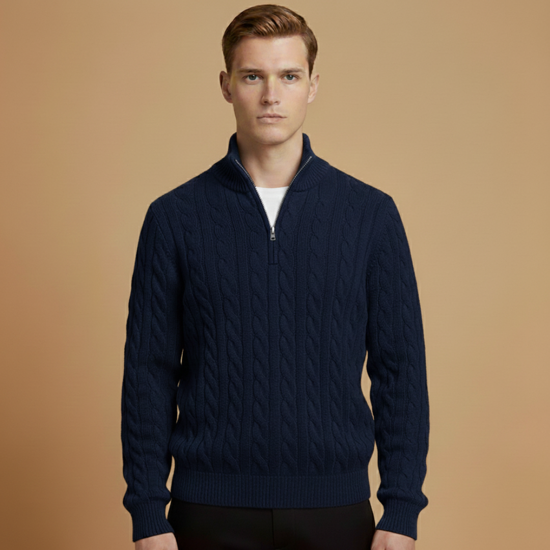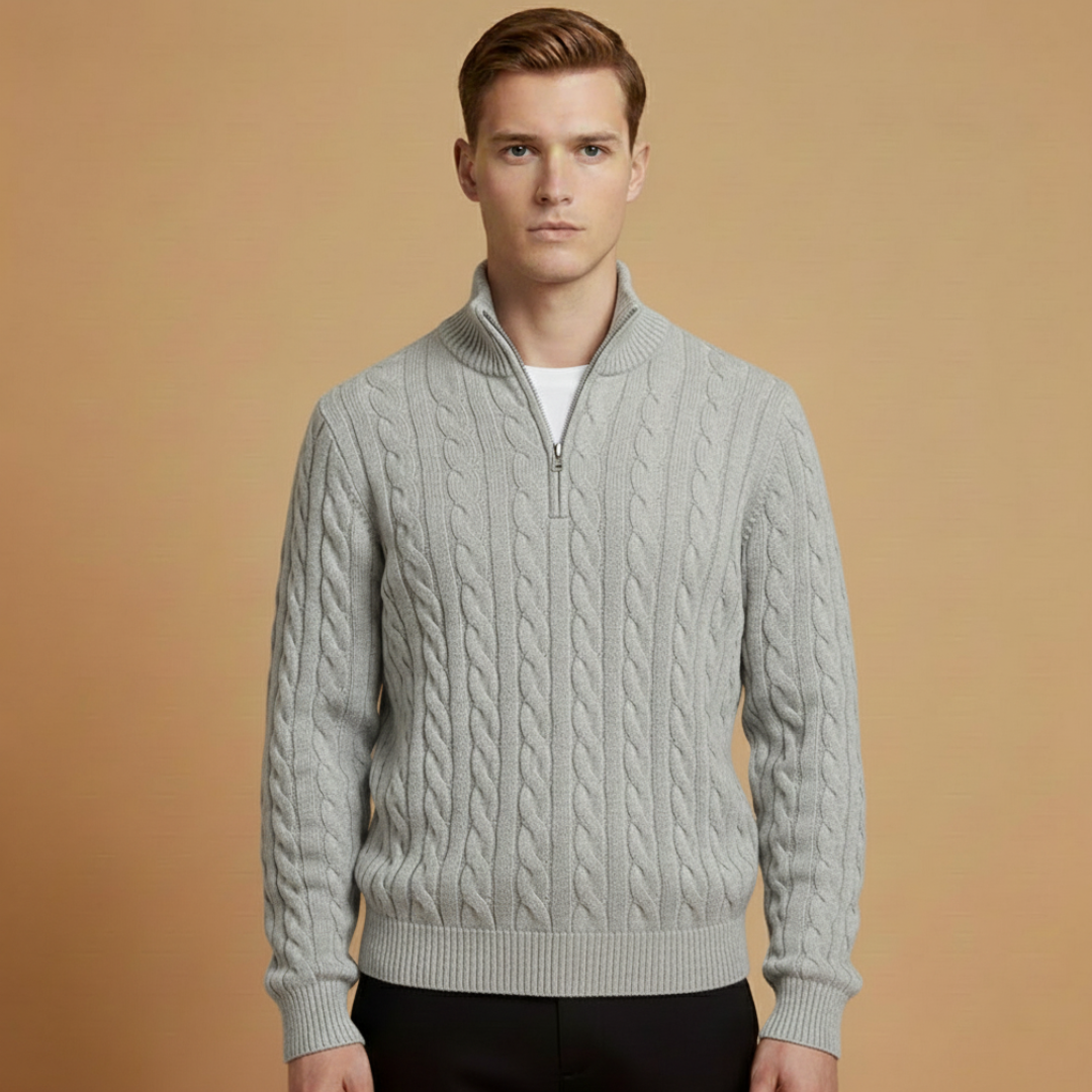 This men’s sweater features a half-zip neckline with a zipper closure and a cable knit body. Long sleeves are finished with ribbed cuffs, while the straight hem creates an even outline. The body combines textured cable knit with smooth knit sections for a balanced structure.