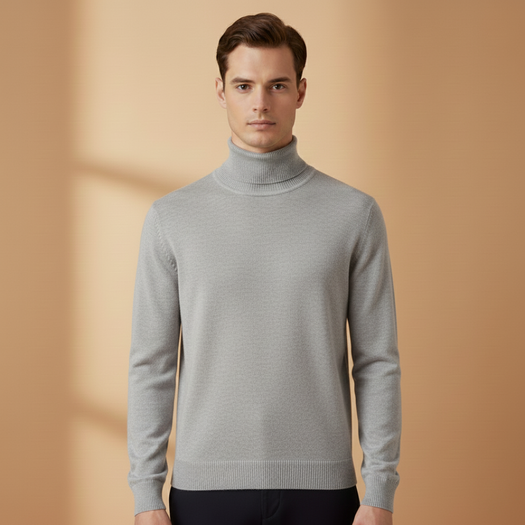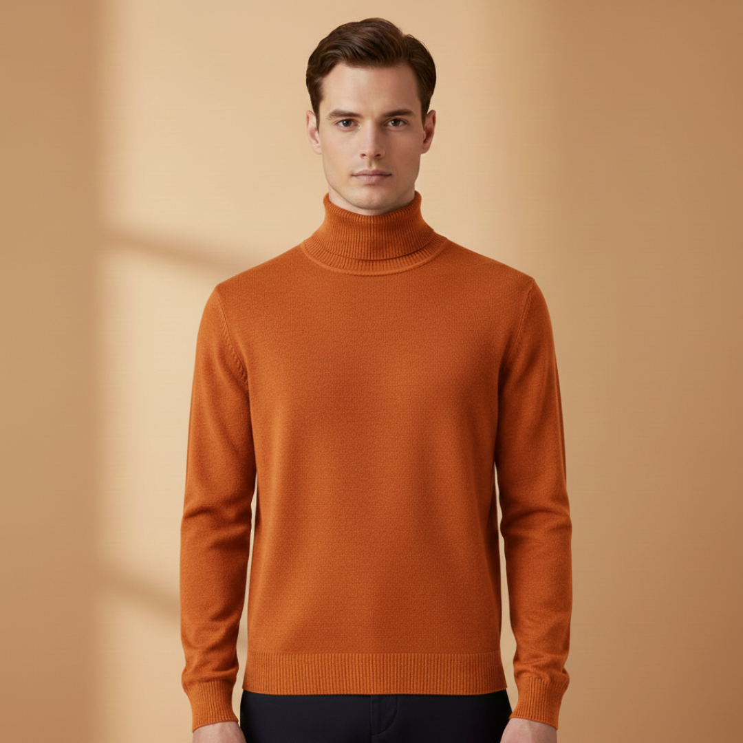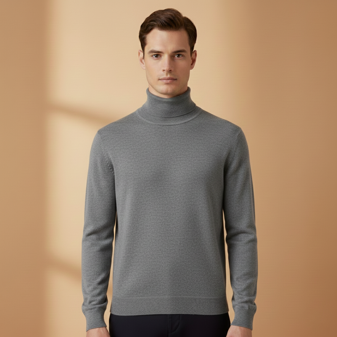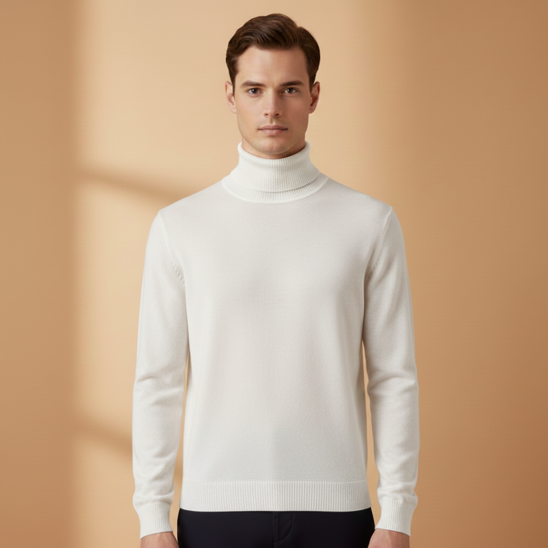 This men’s sweater features a stand-up turtleneck without a closure, long sleeves with ribbed cuffs, and a ribbed hem. The design has no pockets, and the exterior shows a plain knit surface across the full body, creating a consistent appearance from neckline to hem.