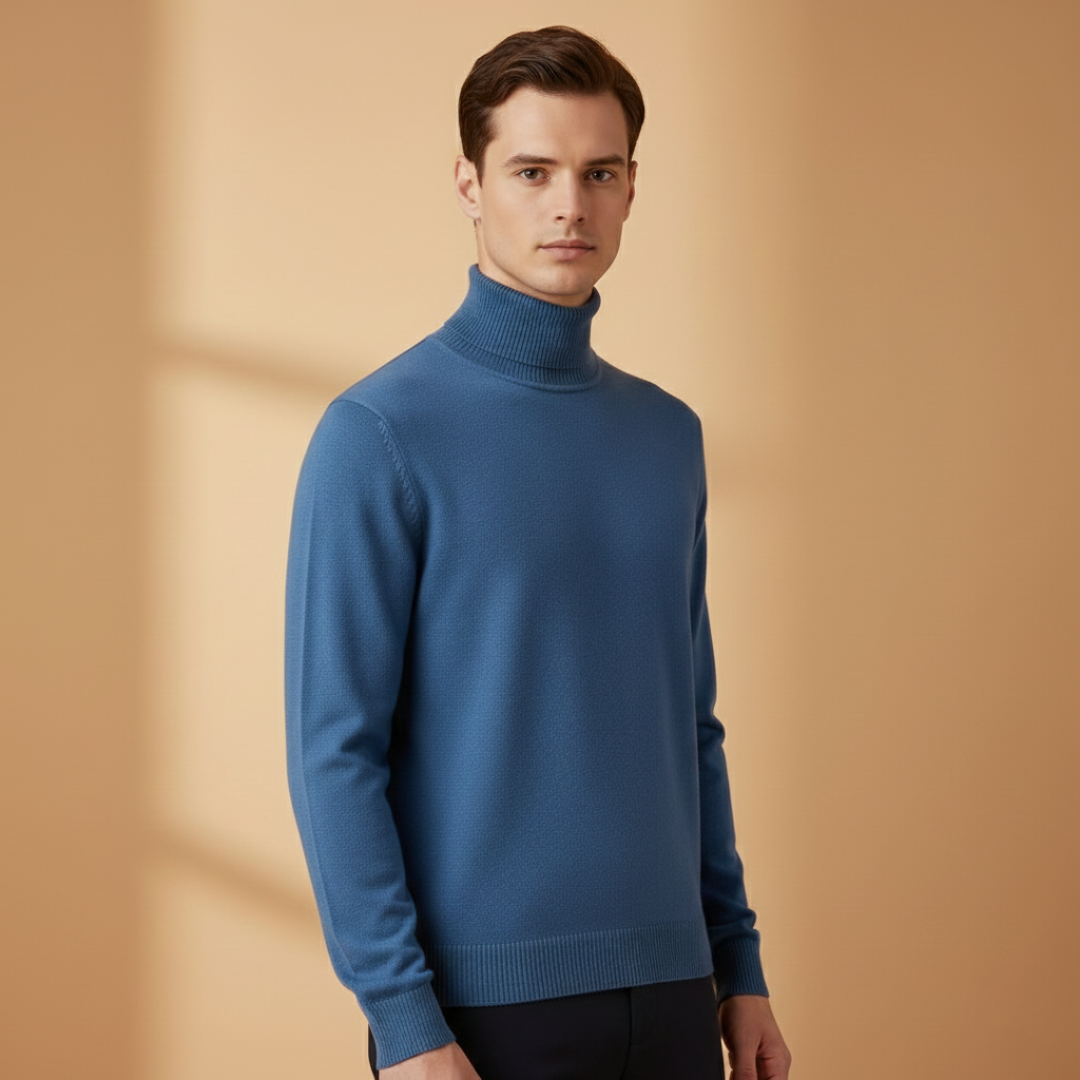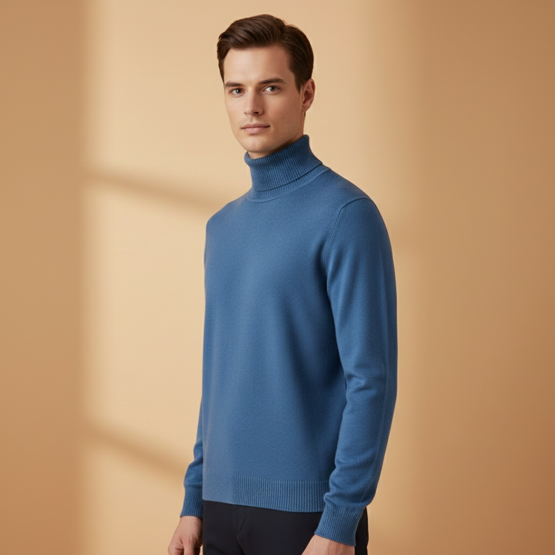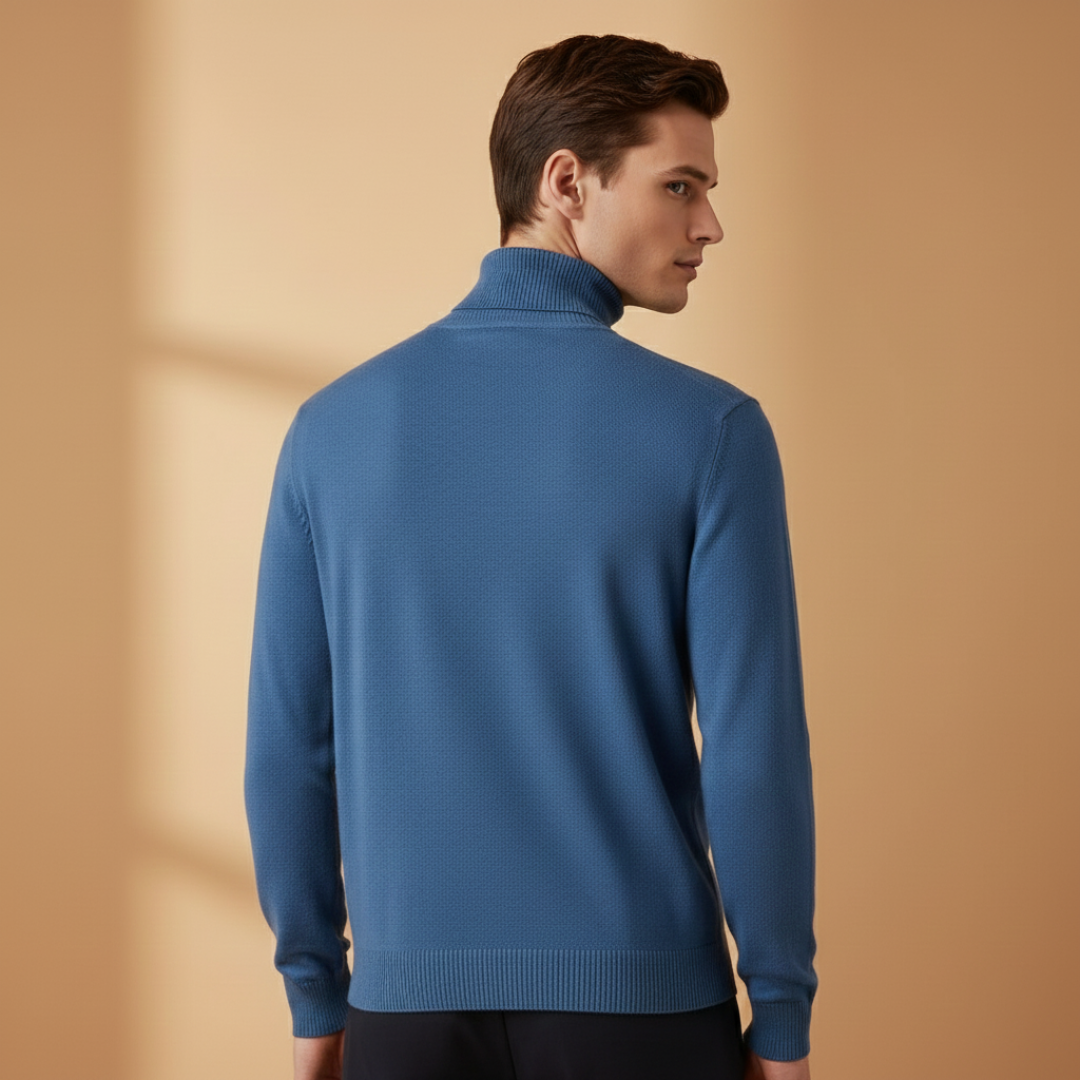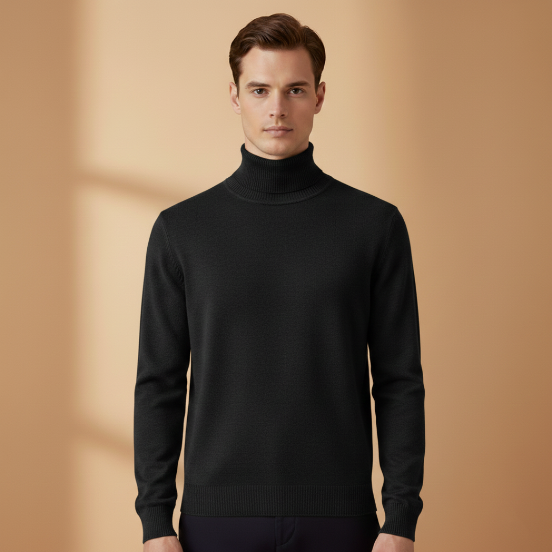 This men’s sweater features a stand-up turtleneck without a closure, long sleeves with ribbed cuffs, and a ribbed hem. The design has no pockets, and the exterior shows a plain knit surface across the full body, creating a consistent appearance from neckline to hem.