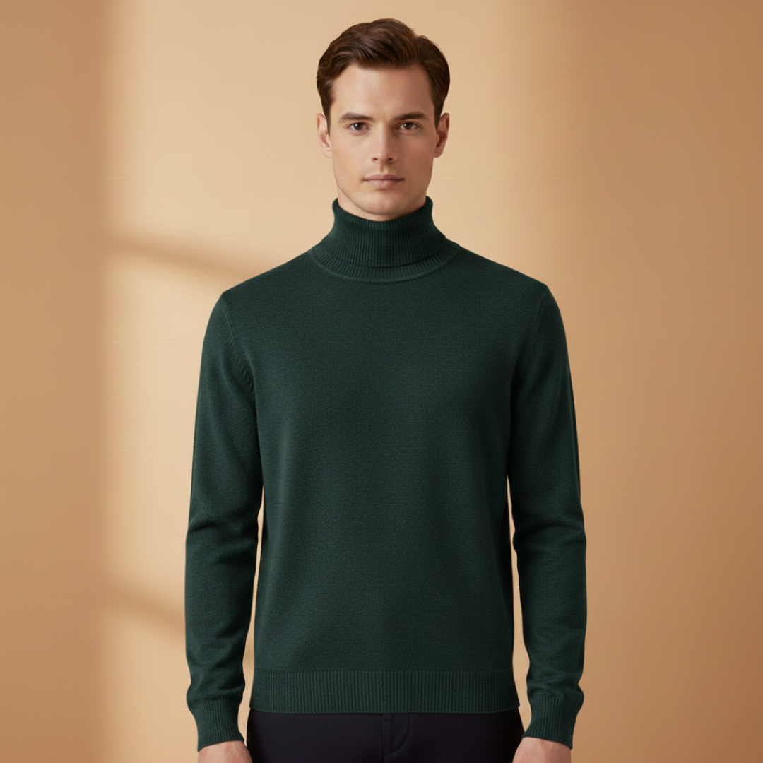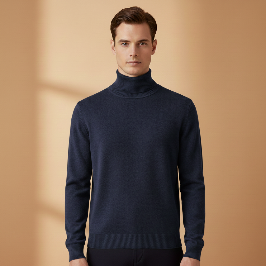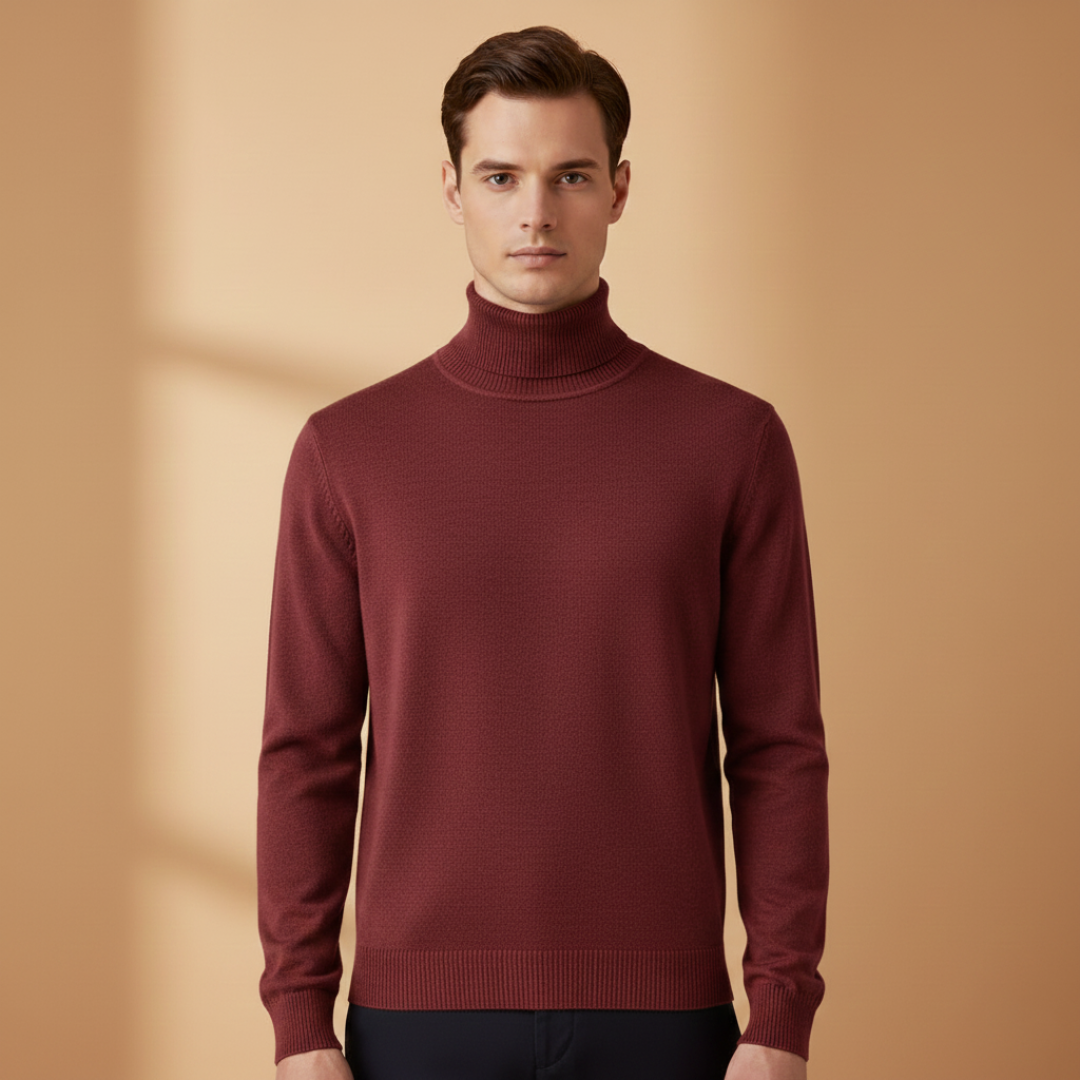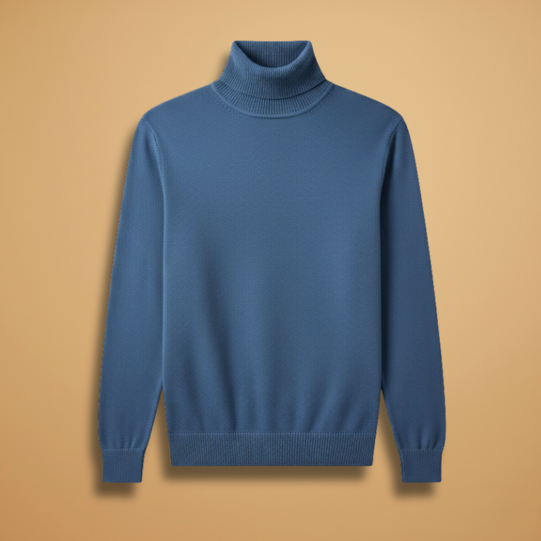 This men’s sweater features a stand-up turtleneck without a closure, long sleeves with ribbed cuffs, and a ribbed hem. The design has no pockets, and the exterior shows a plain knit surface across the full body, creating a consistent appearance from neckline to hem.