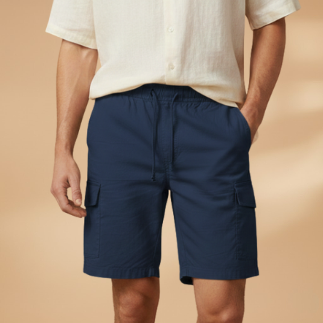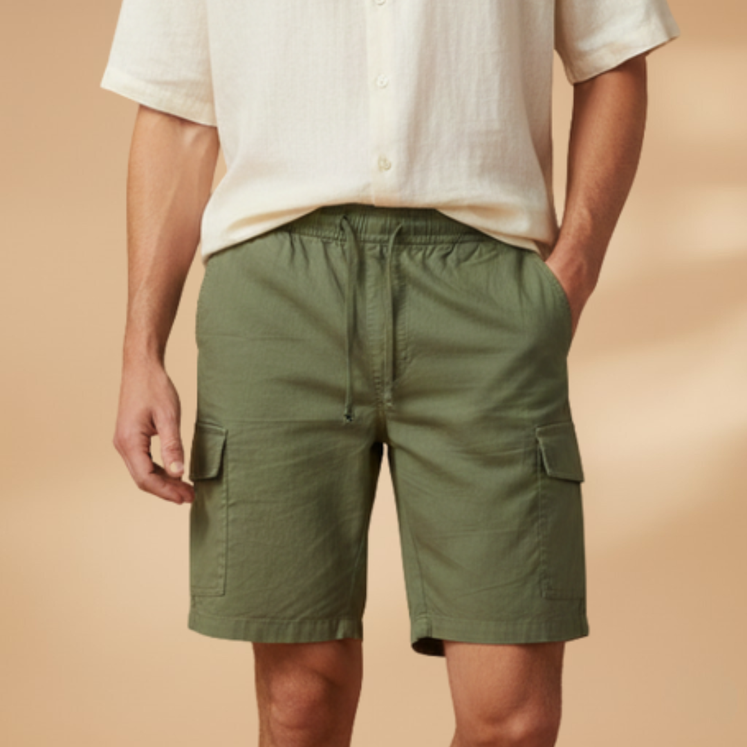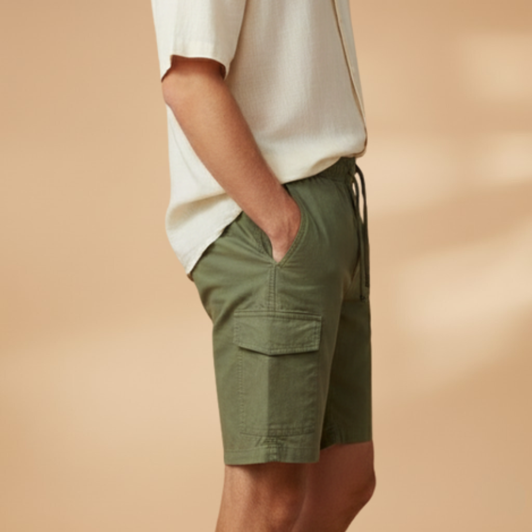 Men’s cargo shorts with a drawstring waist and cargo pockets, designed for summer use