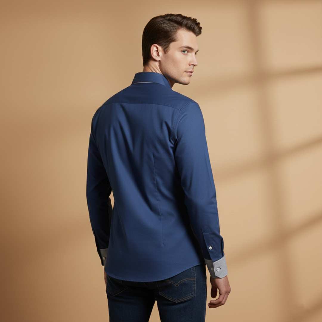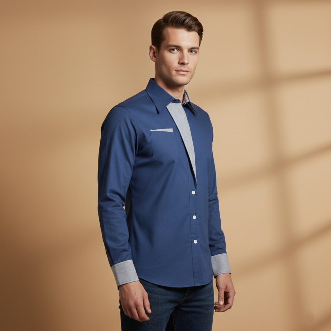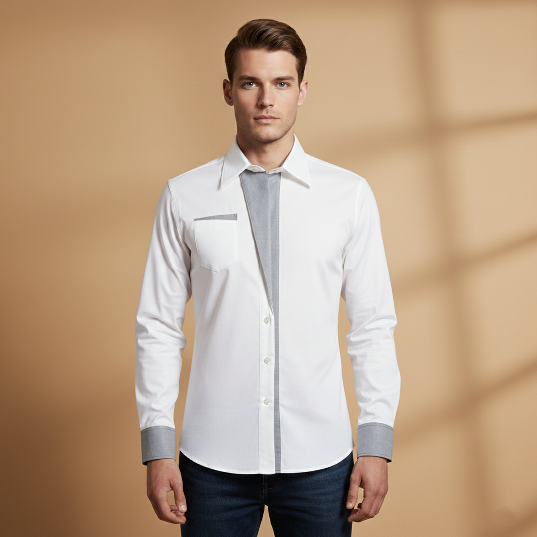 Men's shirt with front button closure and contrasting details at the collar and cuffs