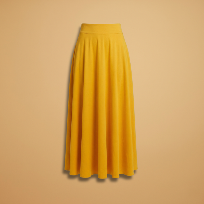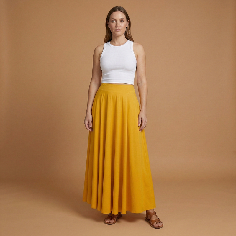 This women’s maxi skirt features a high waistband with an even drape and a flowing A-line silhouette. The skirt extends to ankle or floor length and includes convenient side pockets at hip level. Designed with a wide waistband, panels, and gathers, it maintains shape while layering for spring and summer outfits.