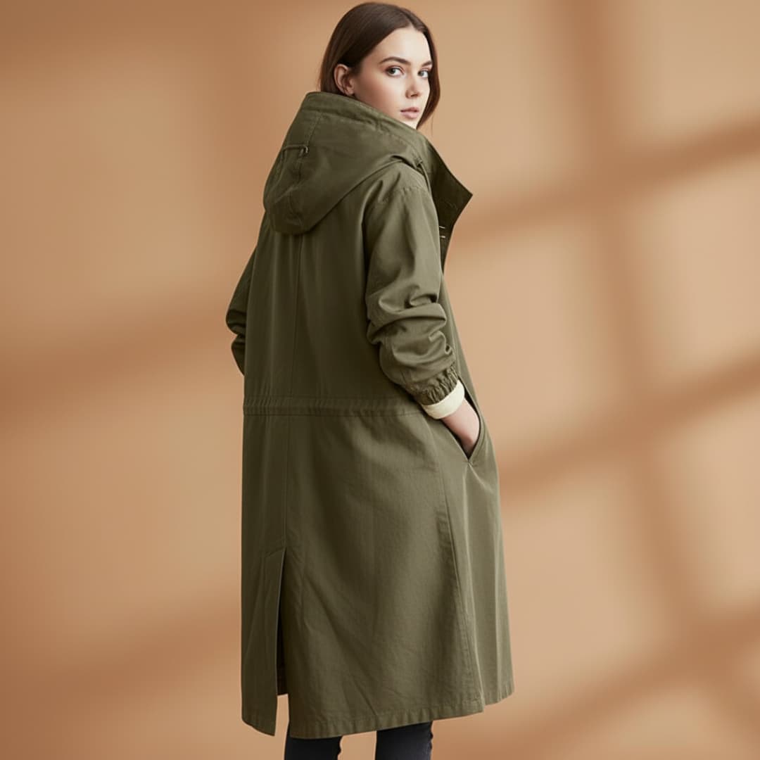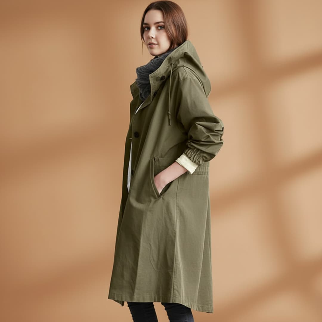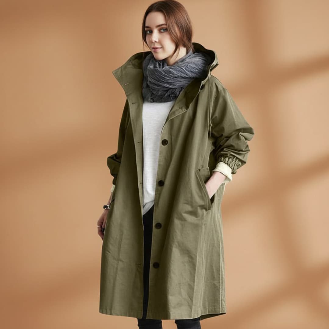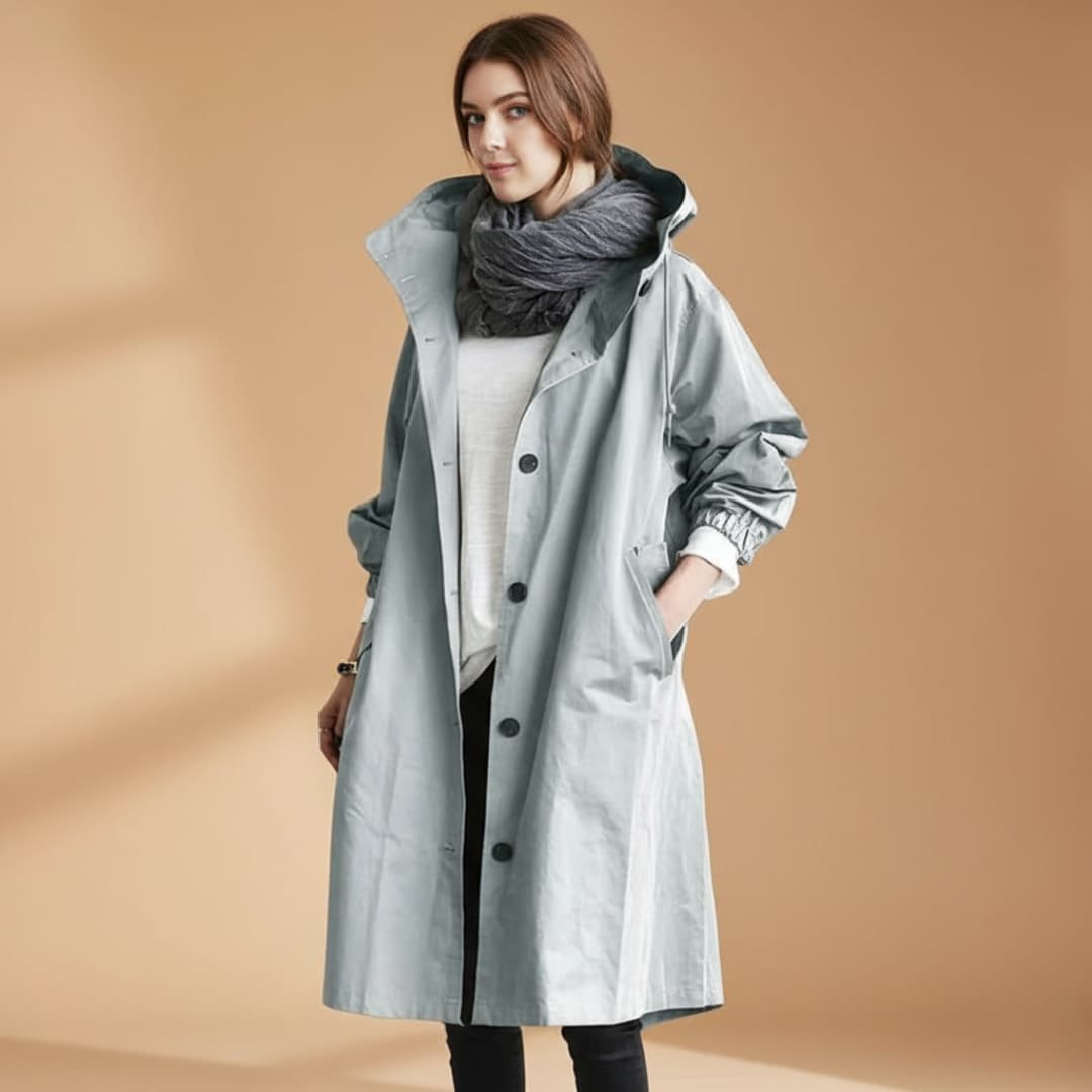 Women’s Long Raincoat with Adjustable Hood and Side Pockets