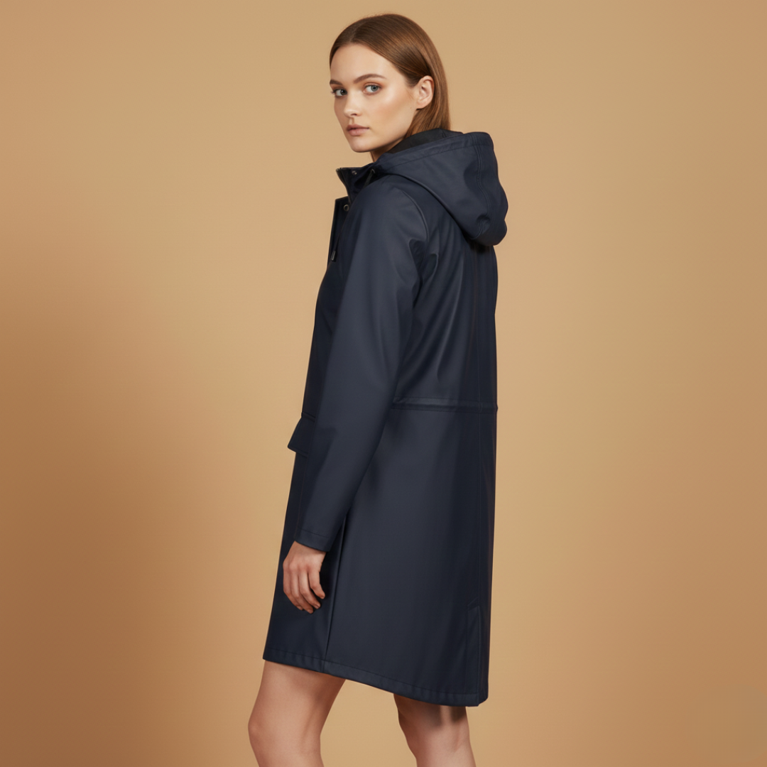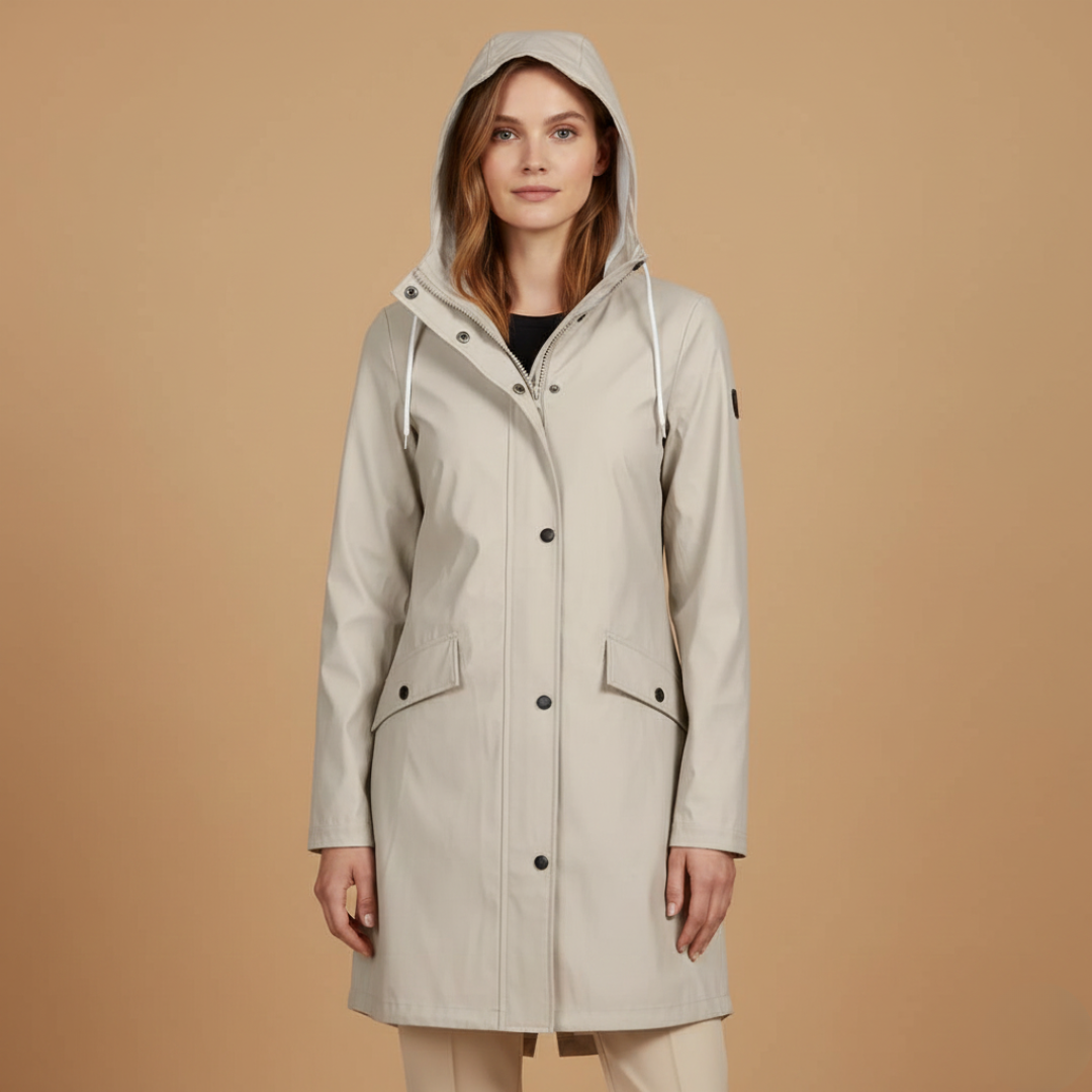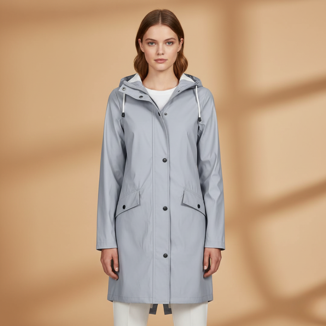 Women’s raincoat designed with a hood, zip closure, and flap pockets.