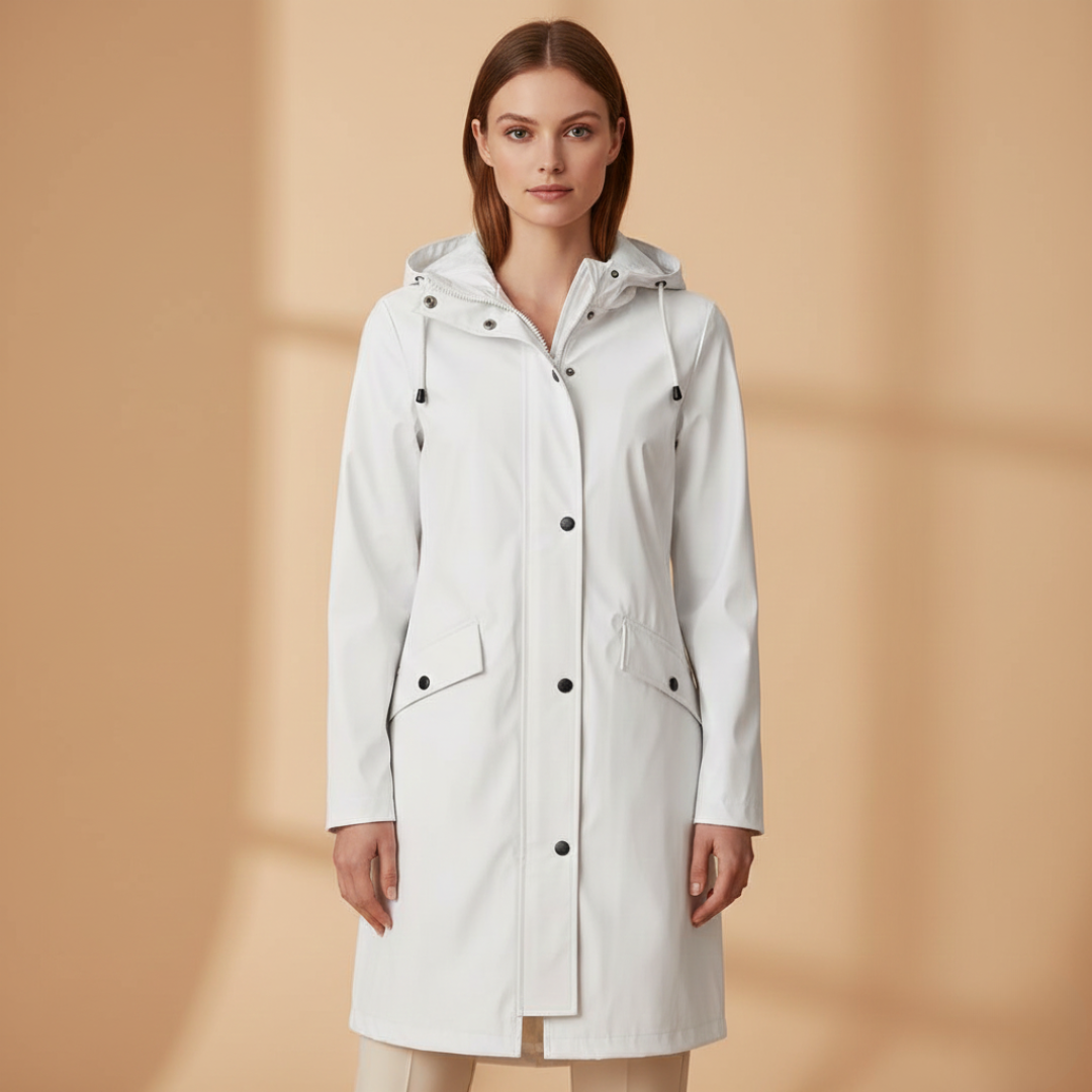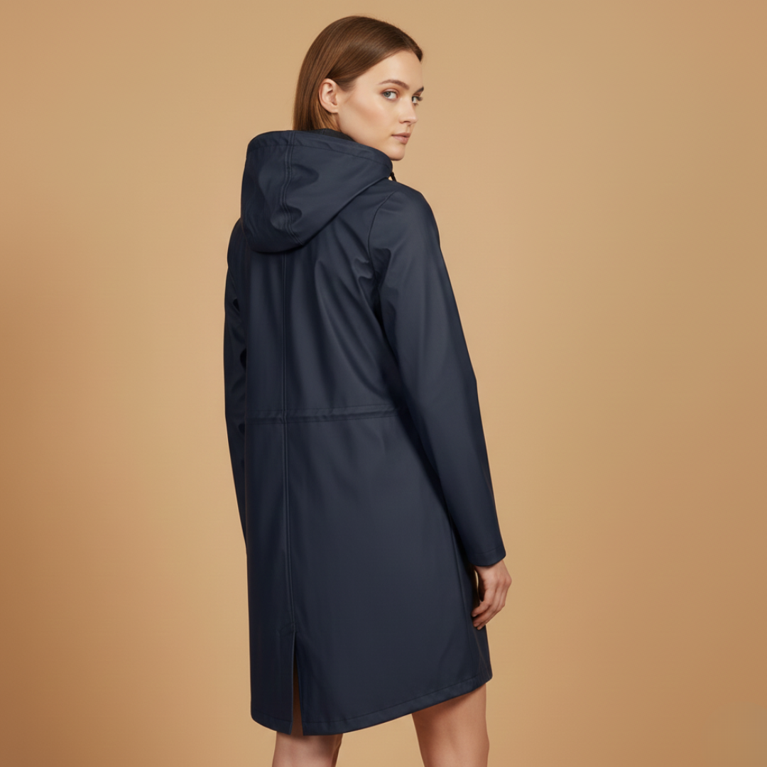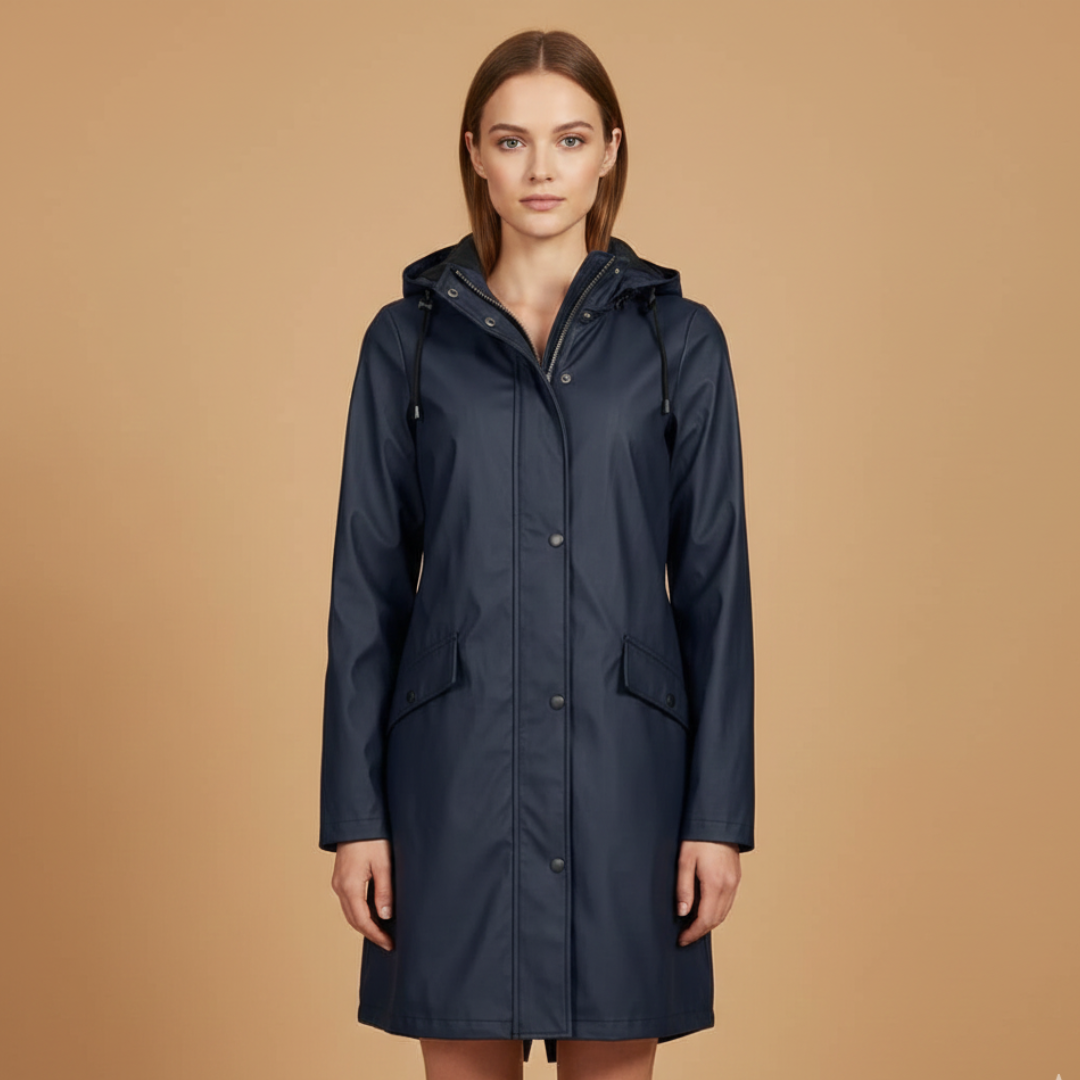 Women’s raincoat designed with a hood, zip closure, and flap pockets.