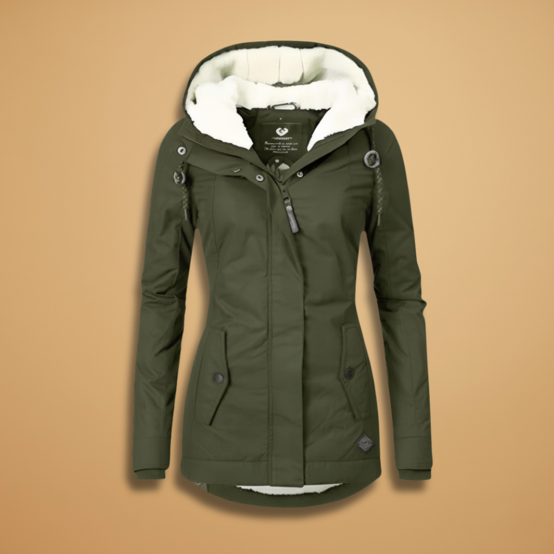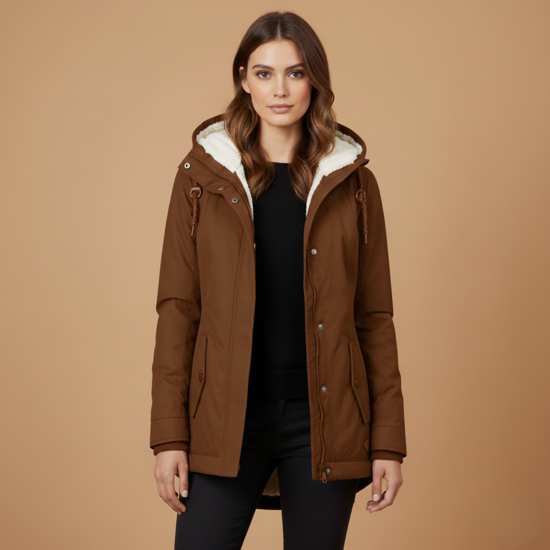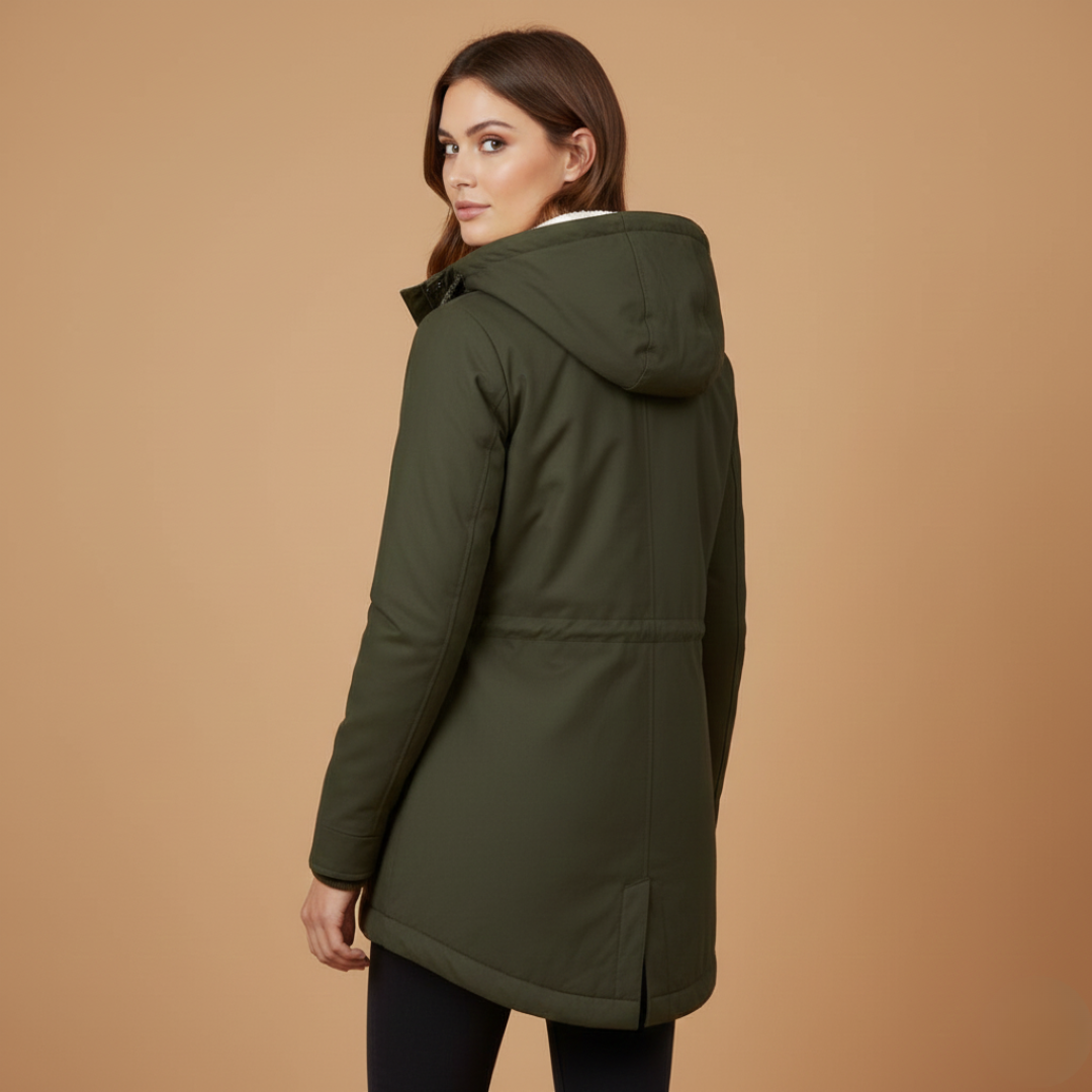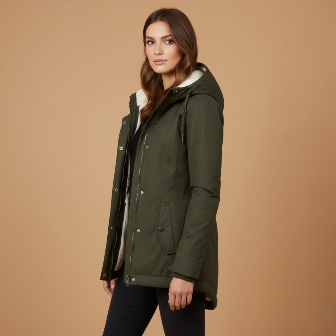 Sherpa-lined hood: Attached hood providing head coverage with soft interior lining.