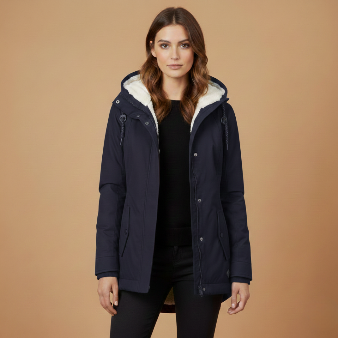 This women’s coat includes an attached hood lined with sherpa and a full zip fastening beneath a snap-button flap. Two side pockets with buttoned flaps sit along the front. Long sleeves finish with straight cuffs. The elongated, rounded hem and textured surface complete the structured outer design.