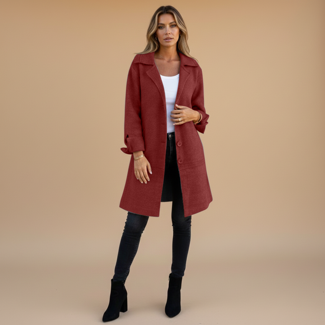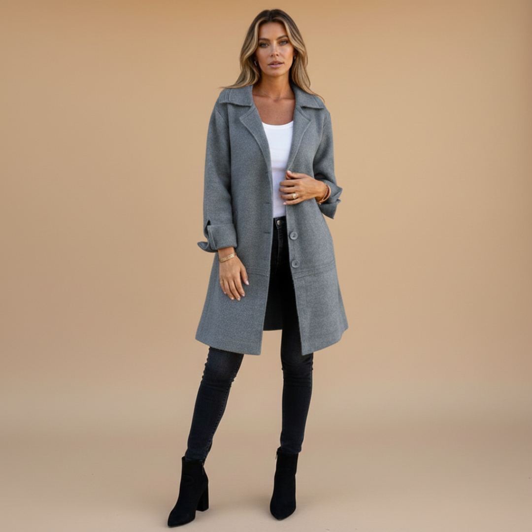 This women’s long coat includes a notched lapel collar with a front button fastening and two side pockets at hip height. The long sleeves finish with turn-up cuffs, while the straight hem continues the coat’s outline. The outer surface shows a textured finish that adds structural definition.